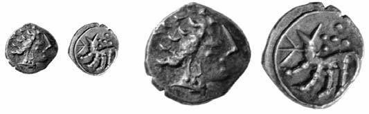 D) BRITANNIA A partire dal I secolo a.C. si conoscono emissioni in oro e in argento, meno comuni quelle in bronzo. Le emissioni in oro (stateri) sembrano piuttosto abbondanti, e ricordano alla lontana le imitazioni balcaniche di monete macedoni: da un lato osserviamo una testa, a volte completamente deformata-destrutturata o resa con piccoli dettagli geometrici (serie ripetitive di segmenti o cerchietti o rombi, che richiamano la capigliatura o la corona d’alloro); dall’altro lato vi è spesso un cavallo, oppure disegni geometrici la cui origine è ormai indecifrabile. Sono per lo più anepigrafi. Altri stateri in oro, ad es. quelli del re Cunobelino (20 d.C.) contengono legende in lettere latine. Le emissioni in Ag più note sono quelle degli Iceni, databili agli anni 40-60 d.C. Occorre Uno dei denari più noti presenta figure geometriche sul D. (convesso) ed un cavallo al